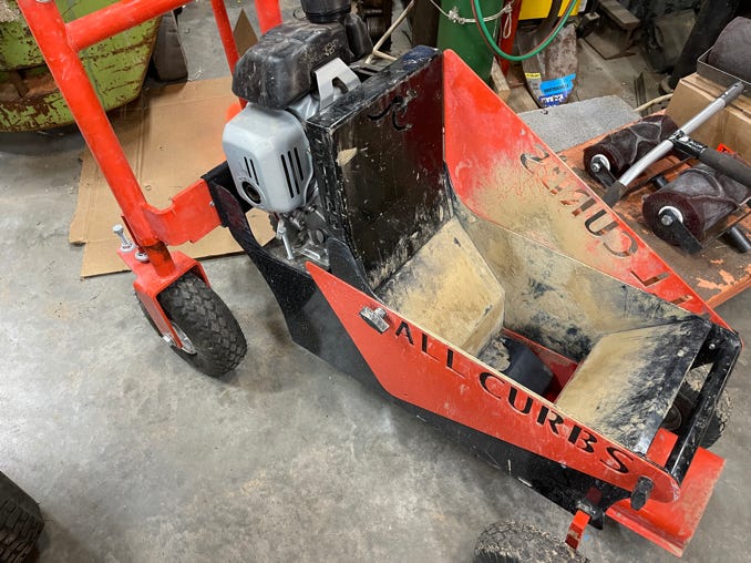 Custom built Curbing machines extrude concrete thru a mold-head into the almost finished curb, eliminating the need for concrete form work.
